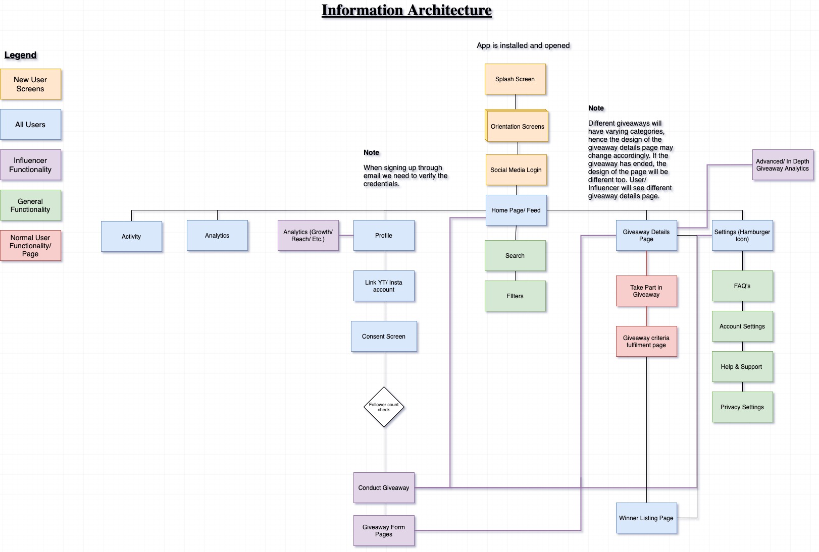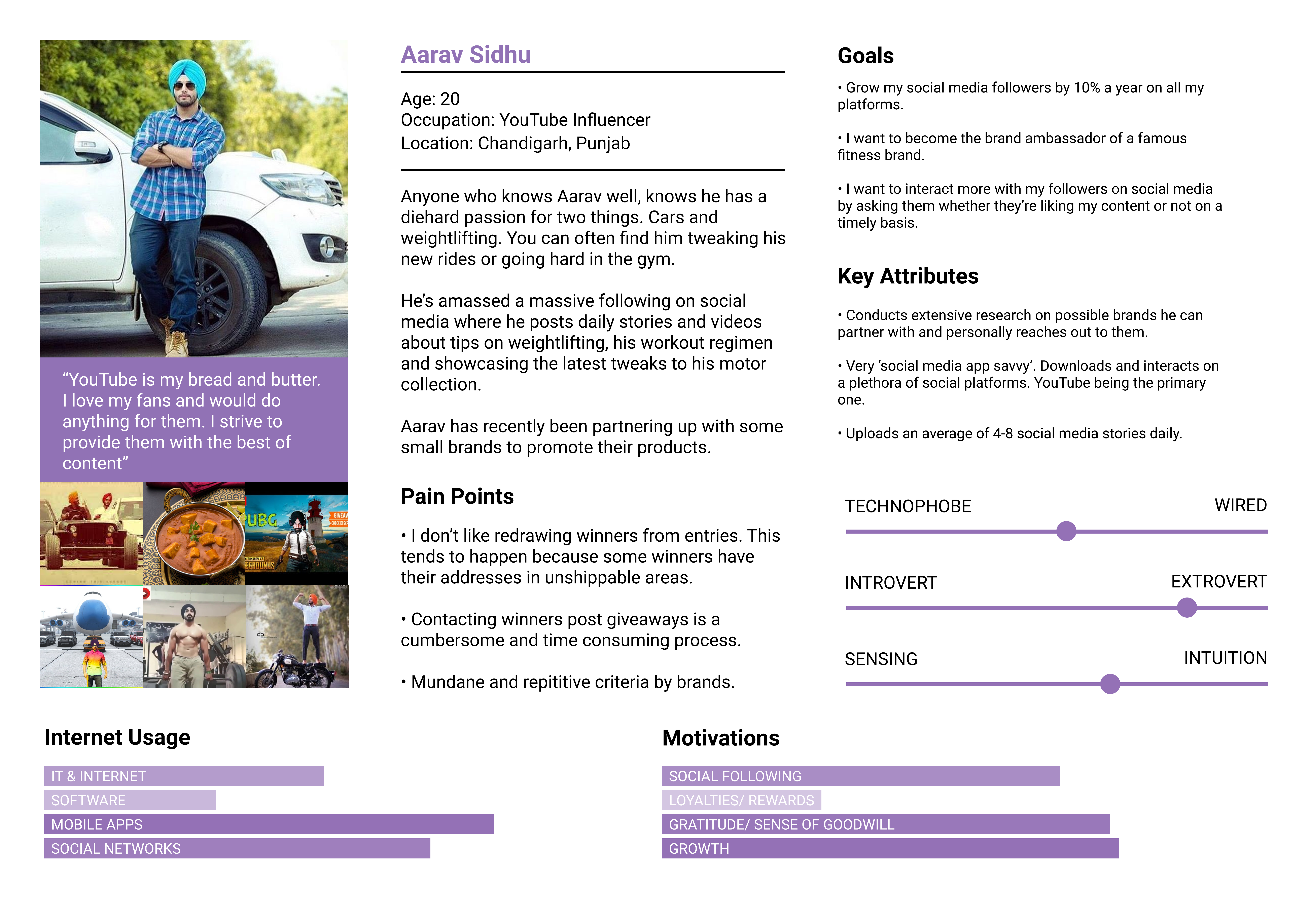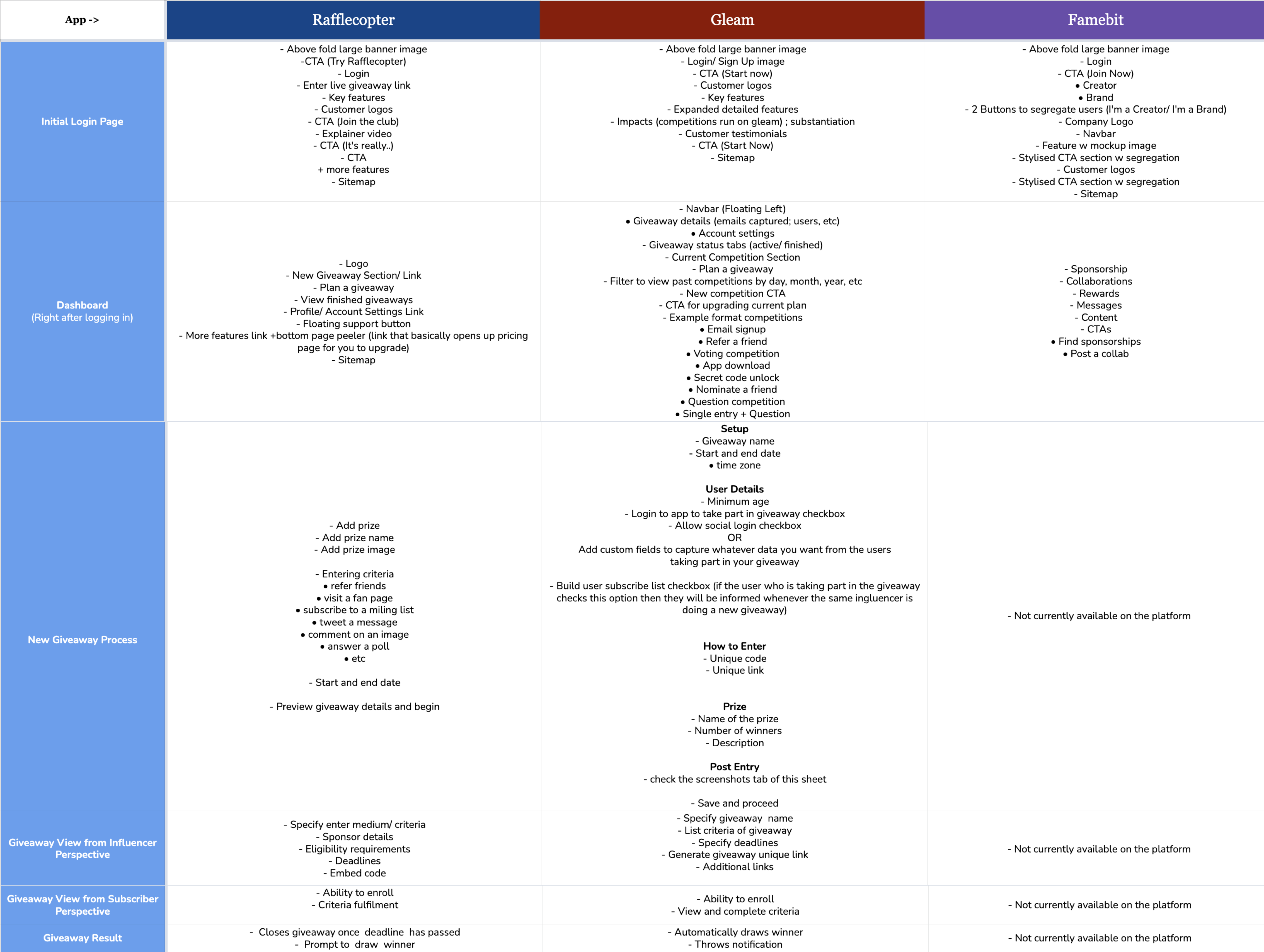 To orient ourselves better around the social media giveaway market we conducted a deep competitive analysis and broad market research. This helped us understand the existing problems and limitations within the existing ecosystem. The market research helped us synthesise and distill key pain/ joy points centered around this ecosystem whilst the competitor analysis gave the team an insight as to how we could differentiate ourselves from the competition, fine-tune our USP and account for numerous inclusive criterion in our application.