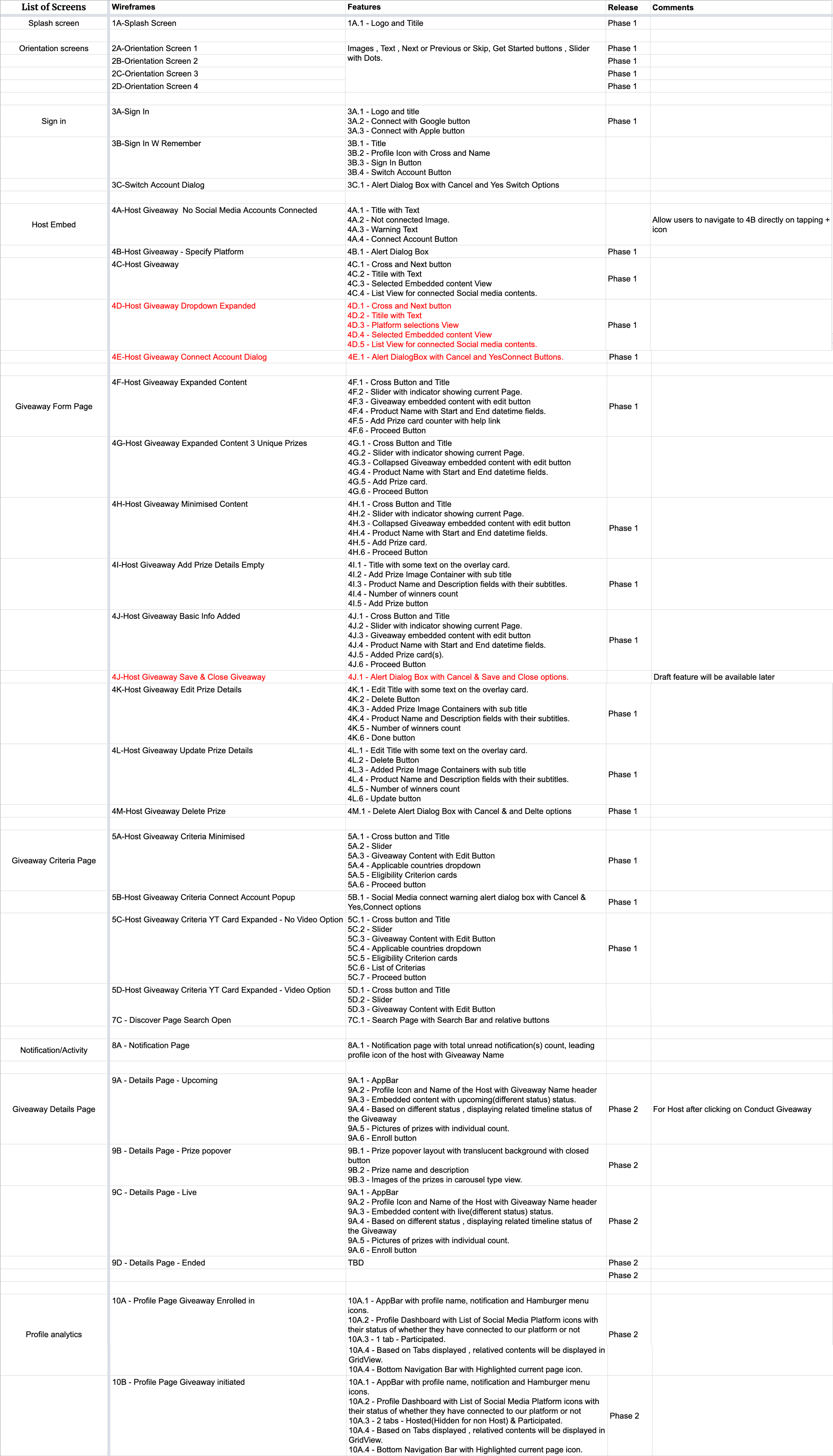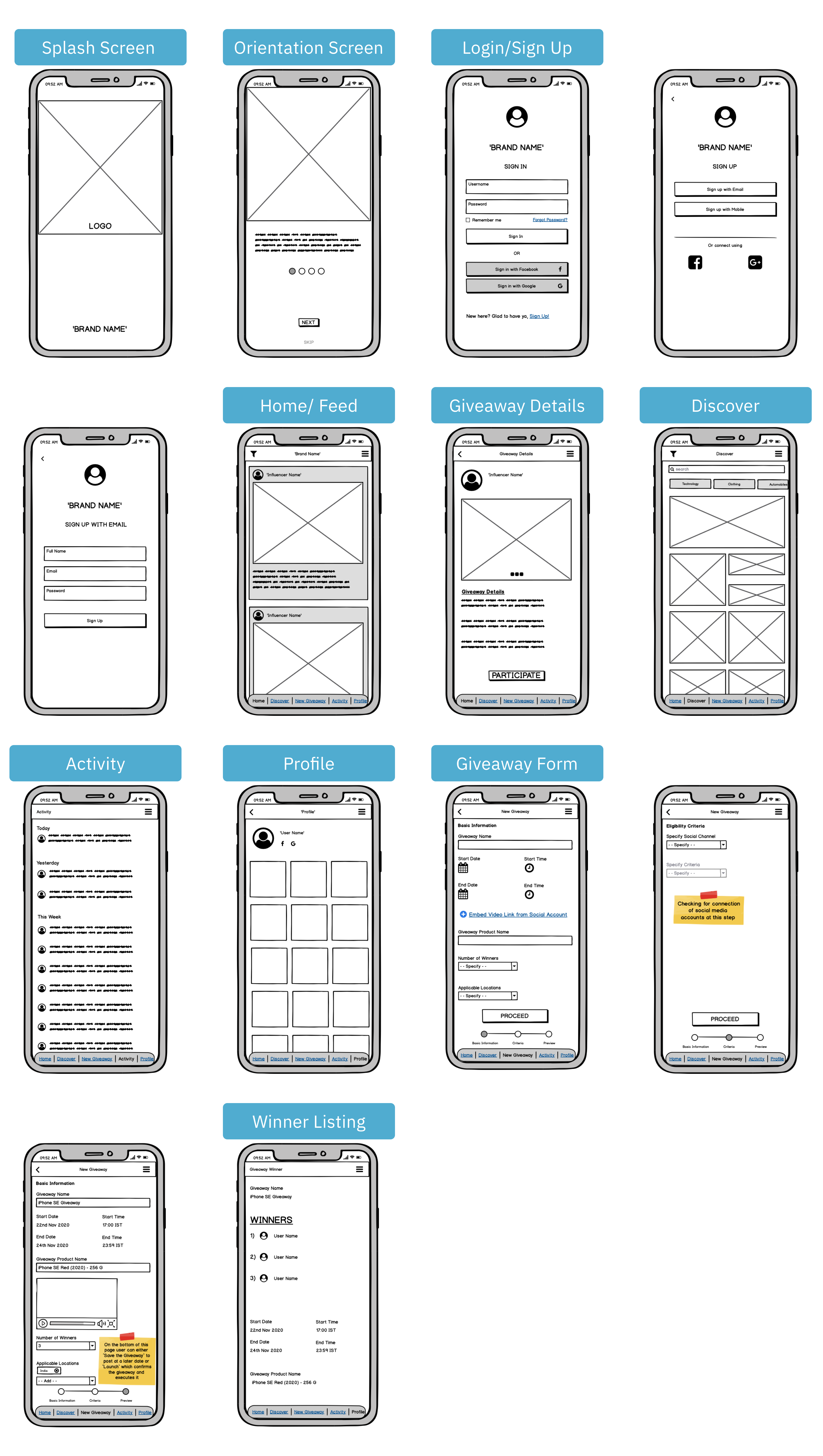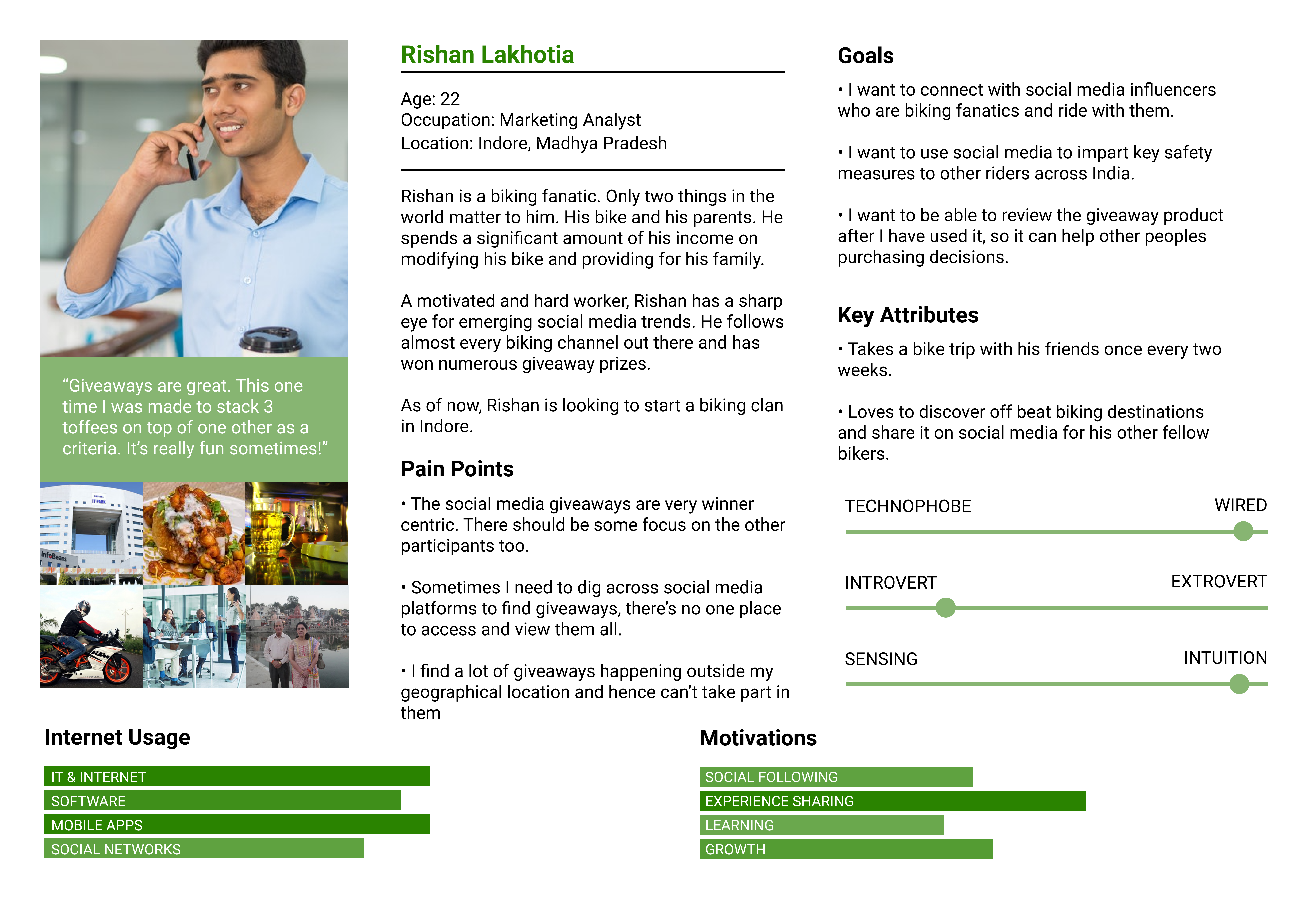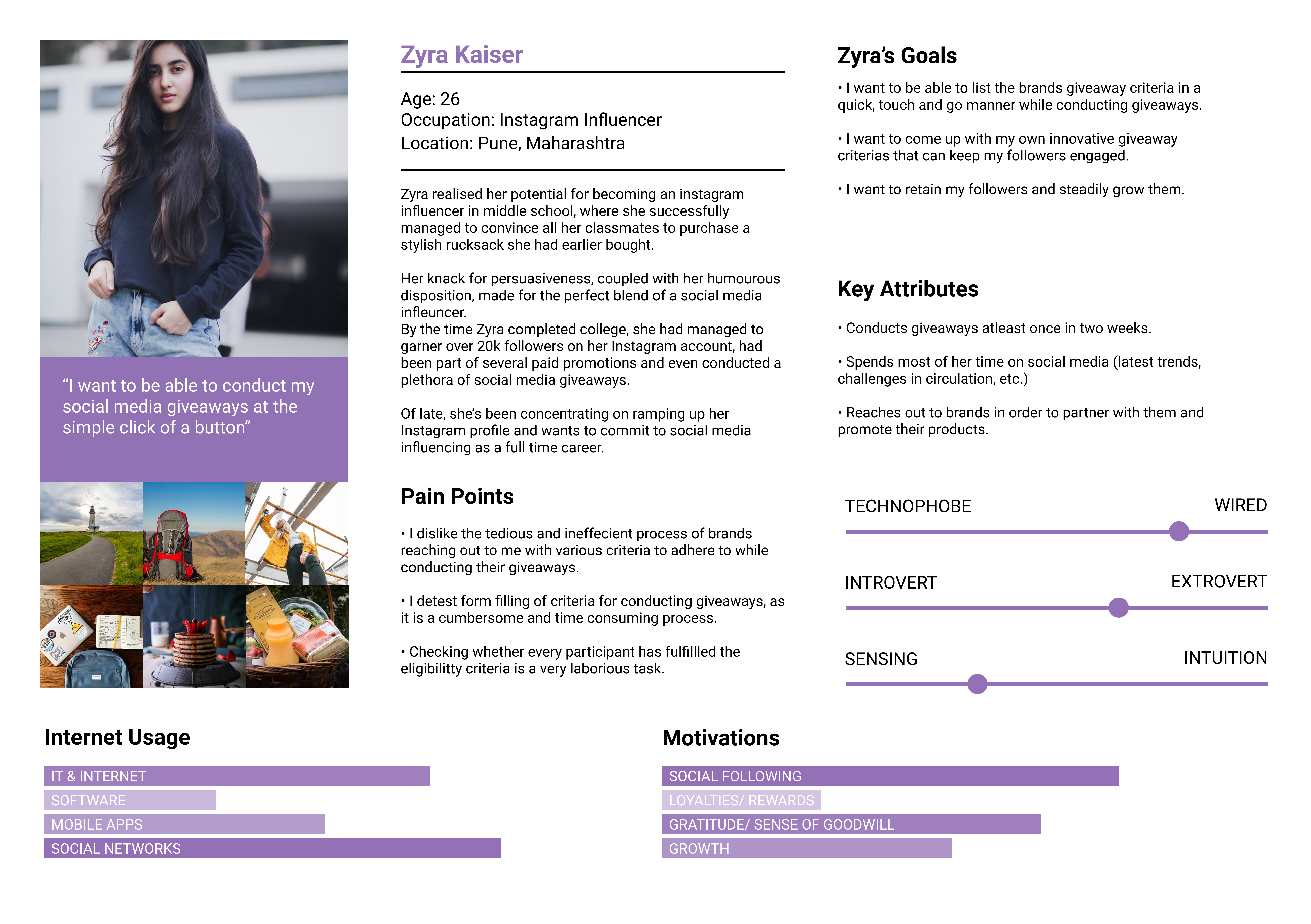 To orient ourselves better around the social media giveaway market we conducted a deep competitive analysis and broad market research. This helped us understand the existing problems and limitations within the existing ecosystem. The market research helped us synthesise and distill key pain/ joy points centered around this ecosystem whilst the competitor analysis gave the team an insight as to how we could differentiate ourselves from the competition, fine-tune our USP and account for numerous inclusive criterion in our application.