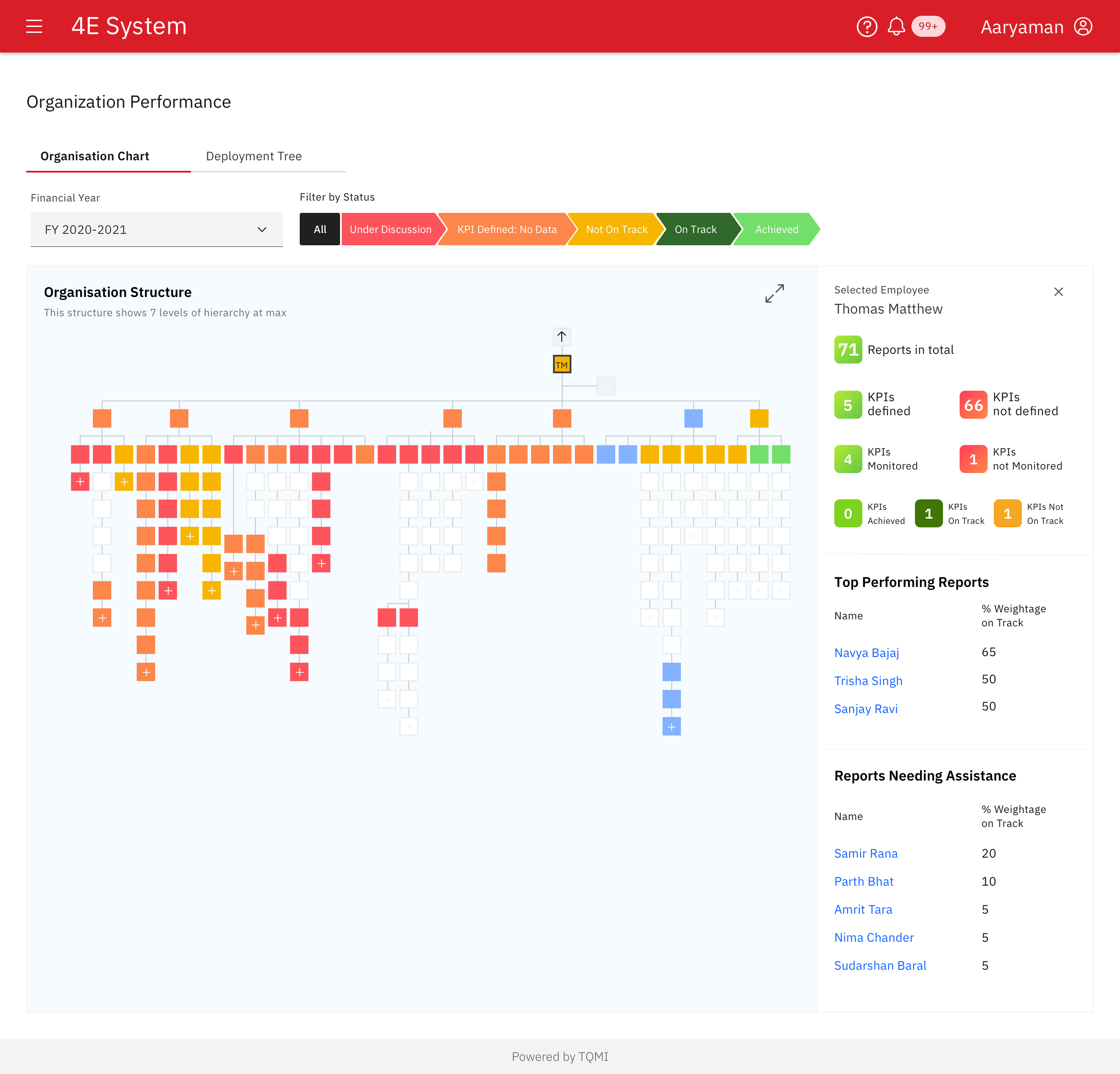 • The organisation structure diagram allows the user to view every persons specific KPI's in the company along with other important aspects such as top performers and employees needing assistance in order to complete their targets. This allows them to 'split' and take on their employees KPI so they may help them achieve their target goals too.