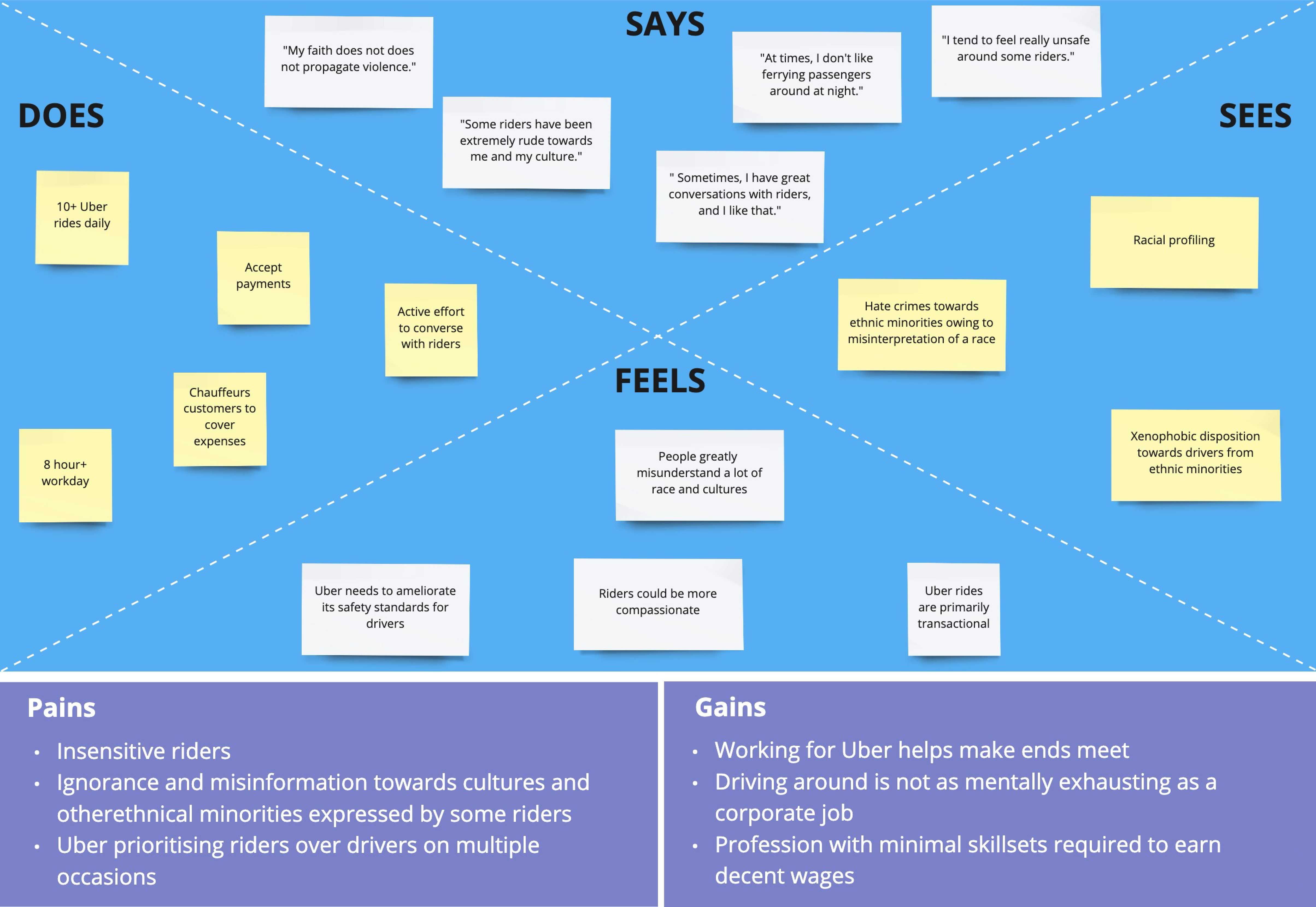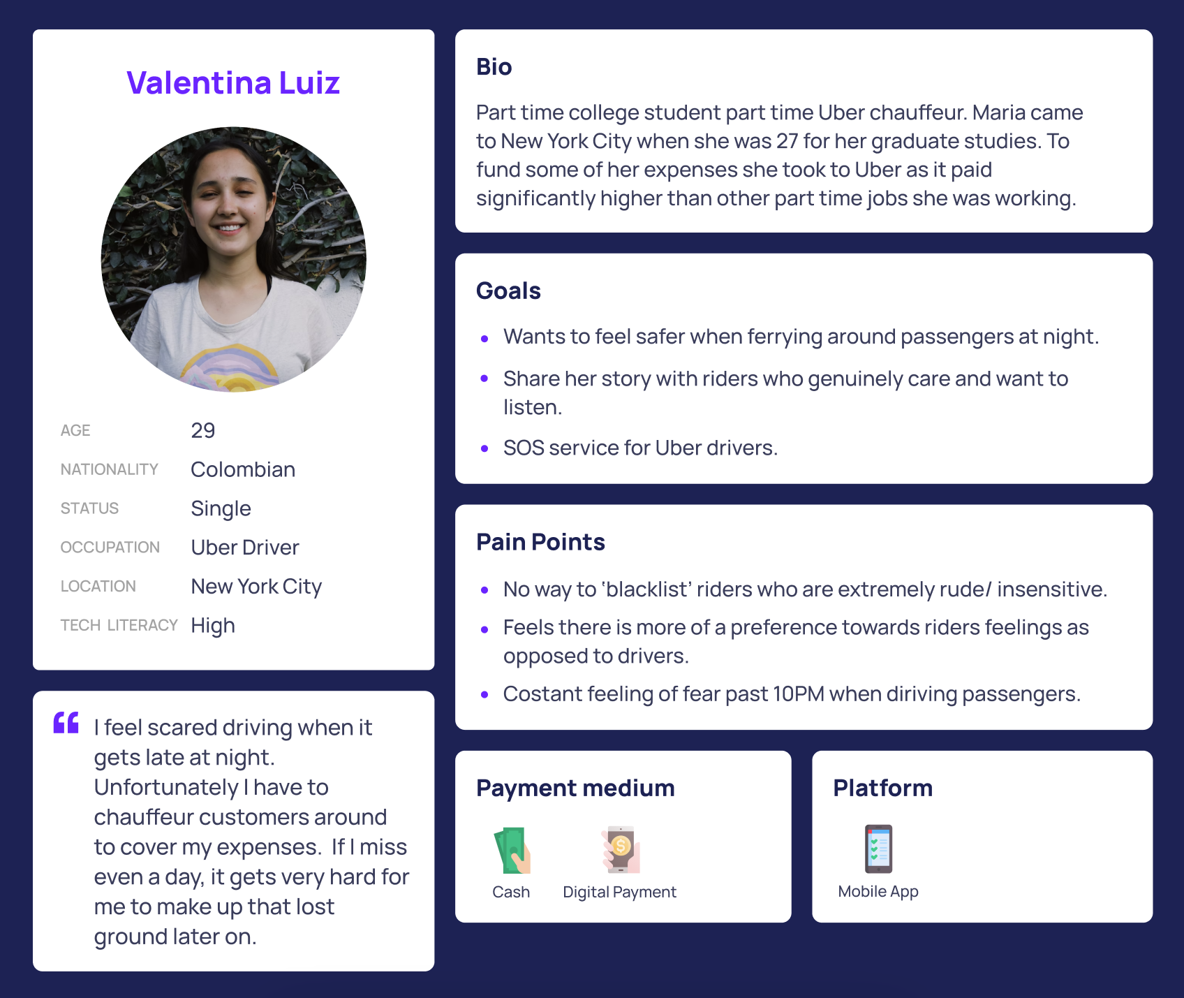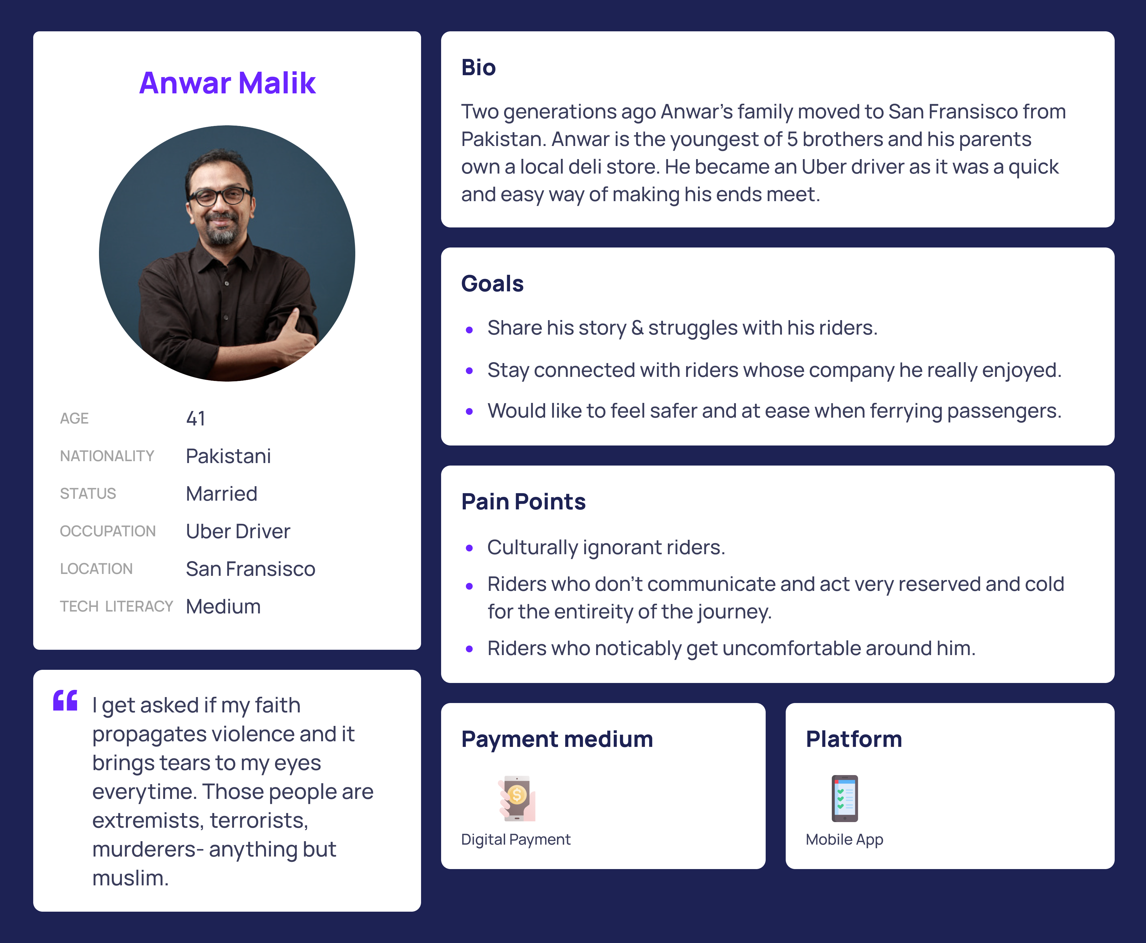 My teammate and I mocked up the following personas based on our findings from the literature review we conducted. These user personas helped us in guiding our design by understanding the goals and motivations of the users here (the Uber driver and the rider). Since we were not able to interview any Uber drivers in America nor any hate crime perpetrators, we solely relied on the findings and data from the literature review.
