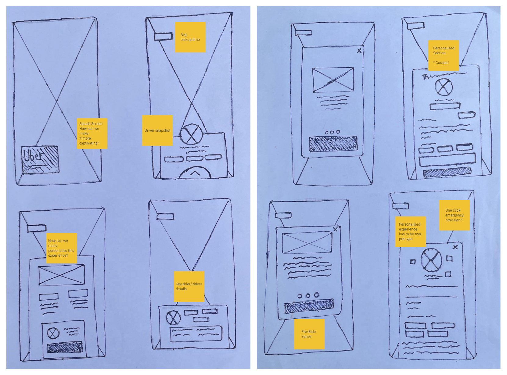 I mocked up paper prototypes before moving on to wireframing and then finally visually designing the features we planned to incorporate into the Uber application.