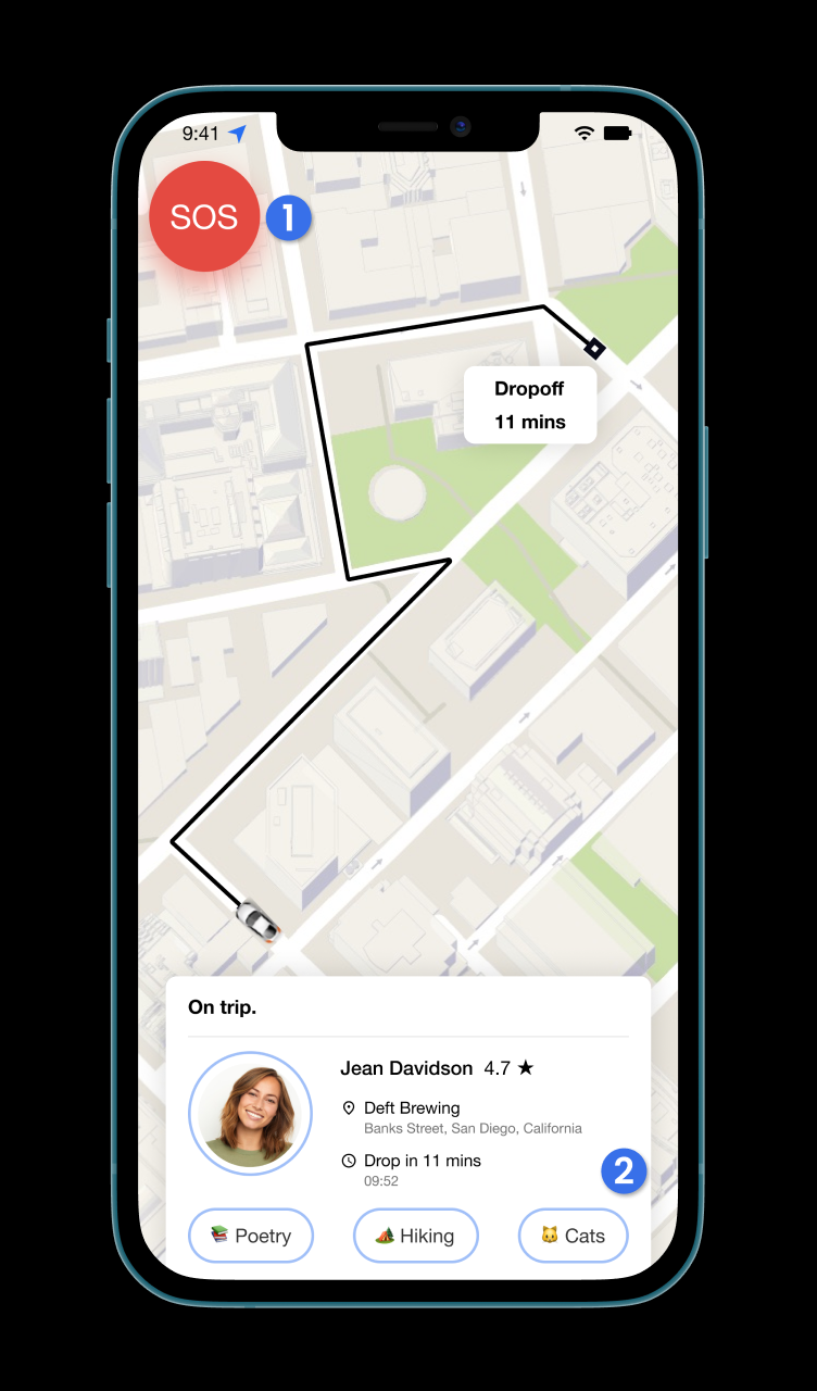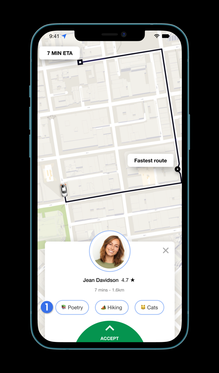 1) We humanised the experience by adding unique rider interests. These are displayed to the driver before and during the ride. The unique interests act to serve as ice breakers that facilitate conversation between rider and driver.