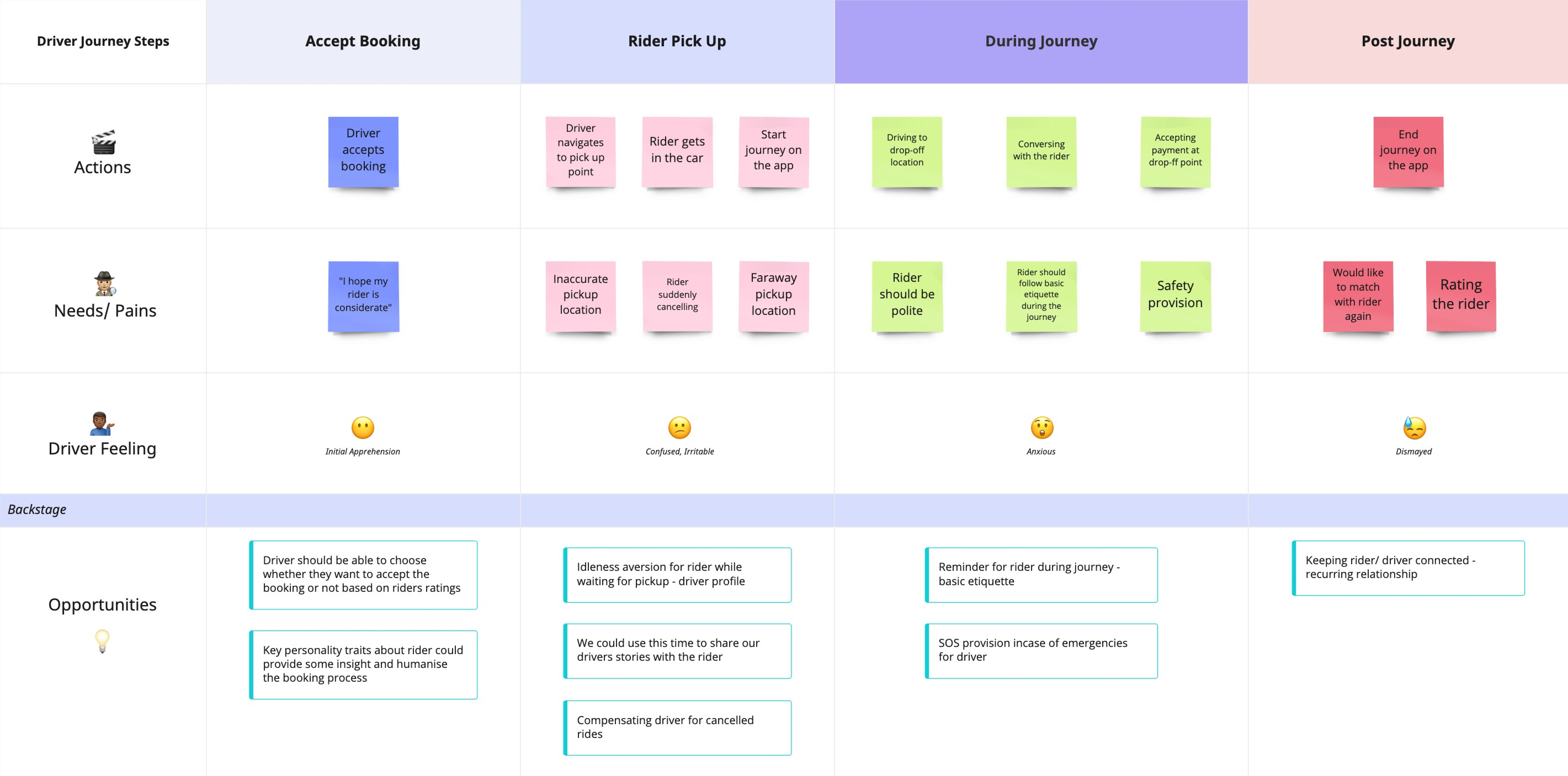 To further empathise with our user group and discover more opportunities during different phases of the driver journey, we made use of journey maps. Breaking down the driver journey into different steps, with each of them having their own needs, pains, feelings and opportunities pushed my teammate and I to think not only broadly but also deeply.