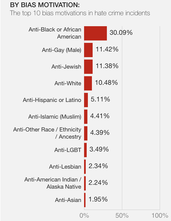 5. Reported hate crimes in 2017 were motivated by hostility based on race/ethnicity (58.1 percent), religion (22.0 percent), sexual orientation (15.9 percent), gender identity (.6 percent) and disability (1.6 percent). Hate crimes targeted Jewish, African-American and LGBT communities at high rates.