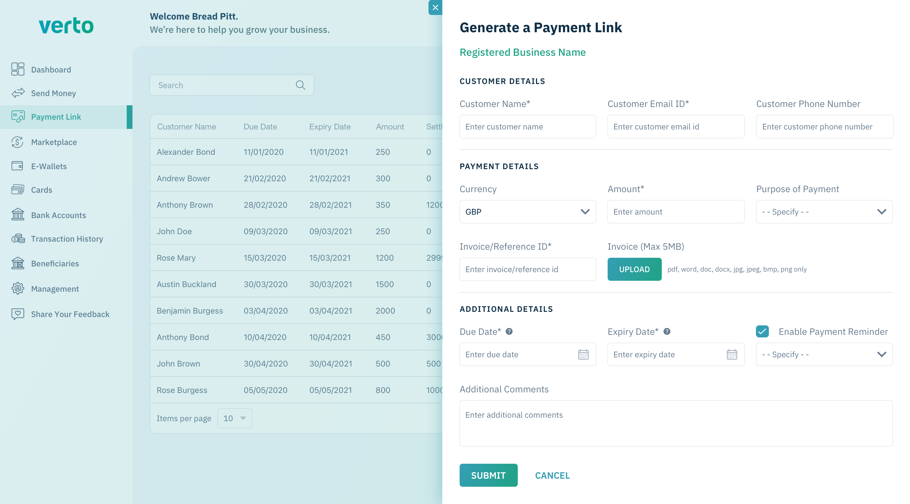 2) Upon clicking this button, a convenient overlay prompts you to fill in essential details including customer information, currency, amount, due date, and additional comments. Easily customise payment requests to suit your needs, ensuring accuracy and clarity.
